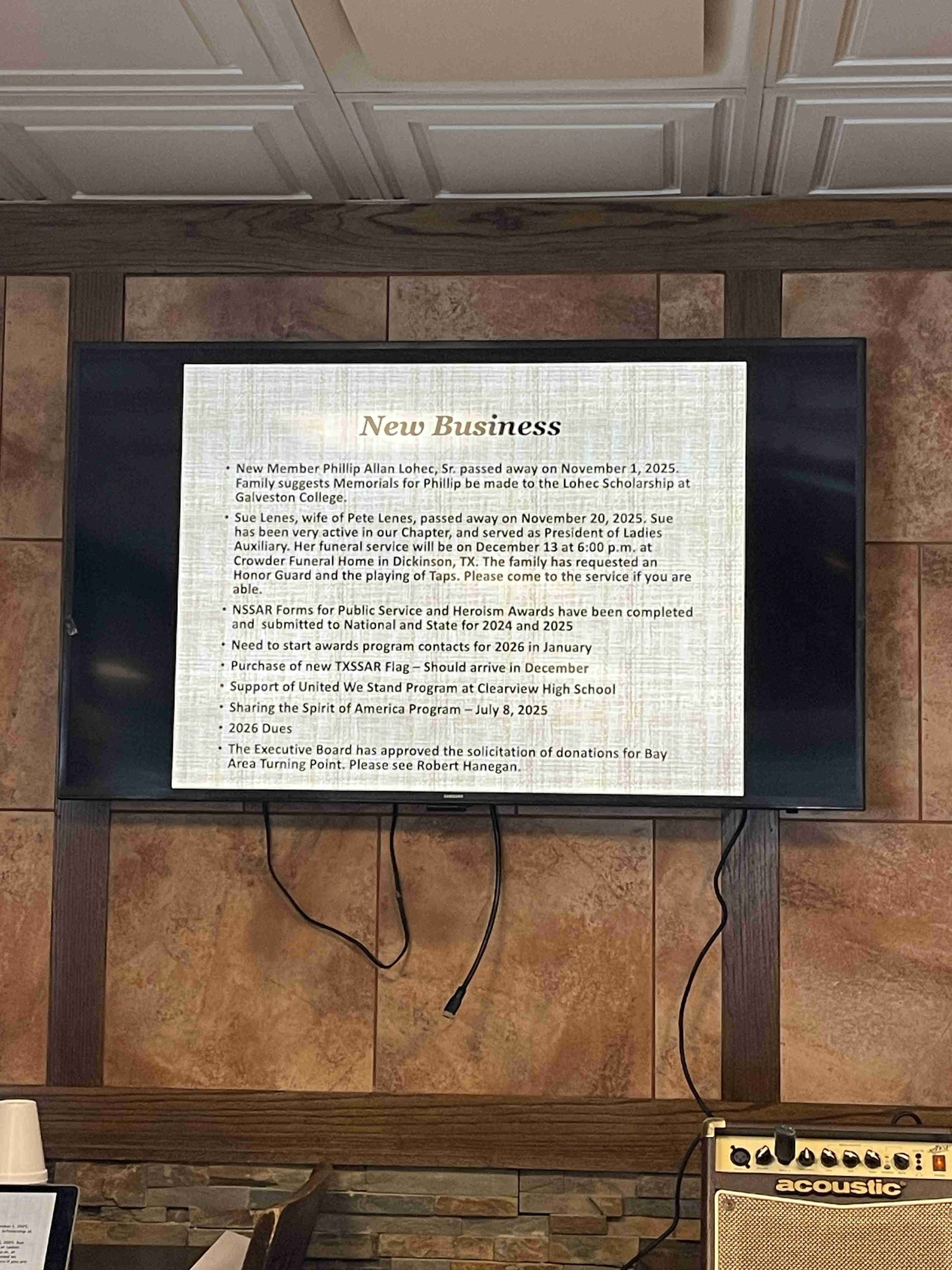 October 15: Chapter meeting: with Hugh Ferguson speaking on his Patriotic Ancestor who is buried in Beaumont Texas